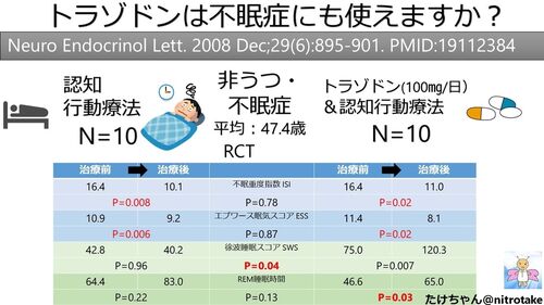 PMID:19112384Neuro Endocrinol Lett. 2008 Dec;29(6):895-901.http://www.nel.edu/trazodone-improves-the-results-of-cognitive-behaviour-therapy-of-primary-insomnia-in-non-depressed-patients-1312/P:原発性不眠症+非うつ病E:認知行動療法+トラゾ…