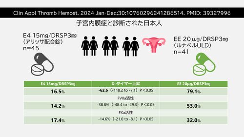 Clin Appl Thromb Hemost. 2024 Jan-Dec;30:10760296241286514. PMID: 39327996 https://pubmed.ncbi.nlm.nih.gov/39327996/ 【論文のPICO】P:子宮内膜症と診断された日本人I:E415mg/DRSP3㎎(アリッサ配合錠)n=45C:EE20μg/DRSP3㎎(ルナベルULD)n=41O…